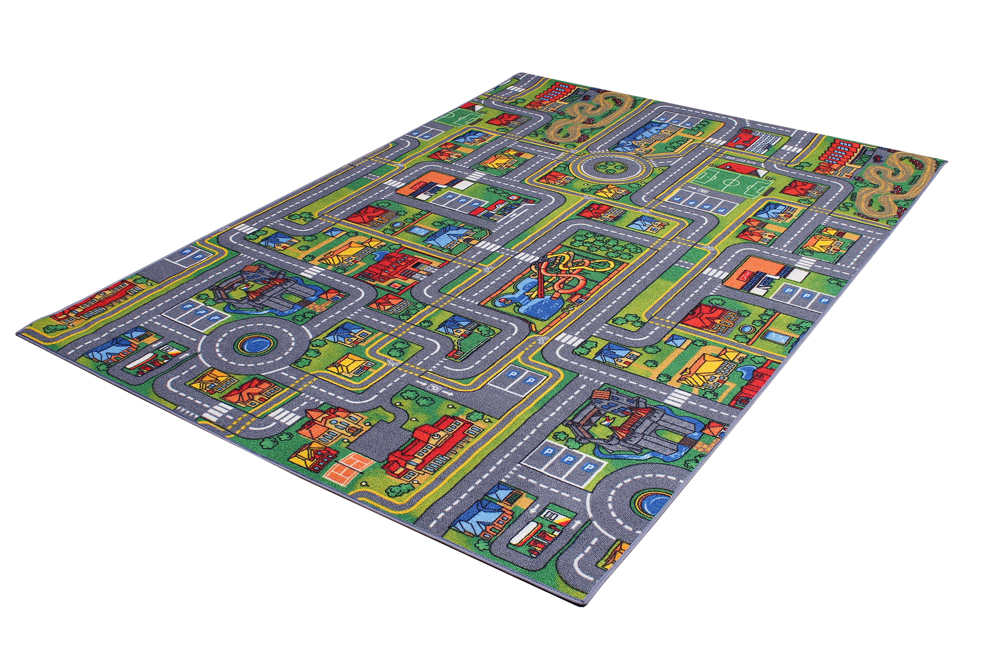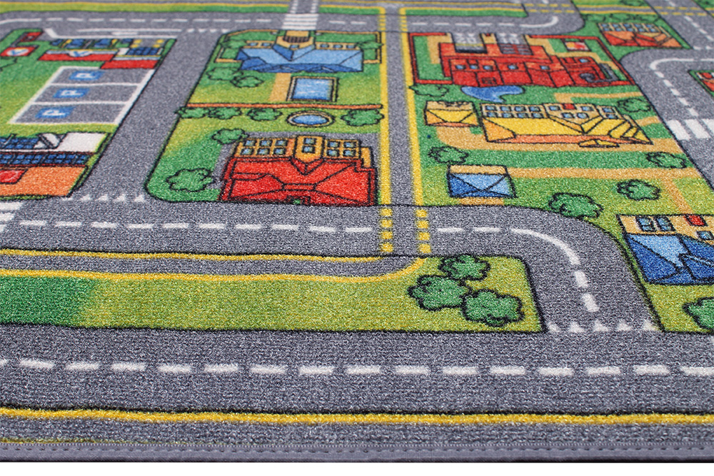 City Life Barnmatta är en bilmatta för barn som älskar att leka med sina leksaksbilar. Den fina stadsillustrationen med bl.a vägar, rondeller, hus och slott som uppmanar barnen till lek. Öglad lugg i 100% PA med halkfri gummerad baksida.