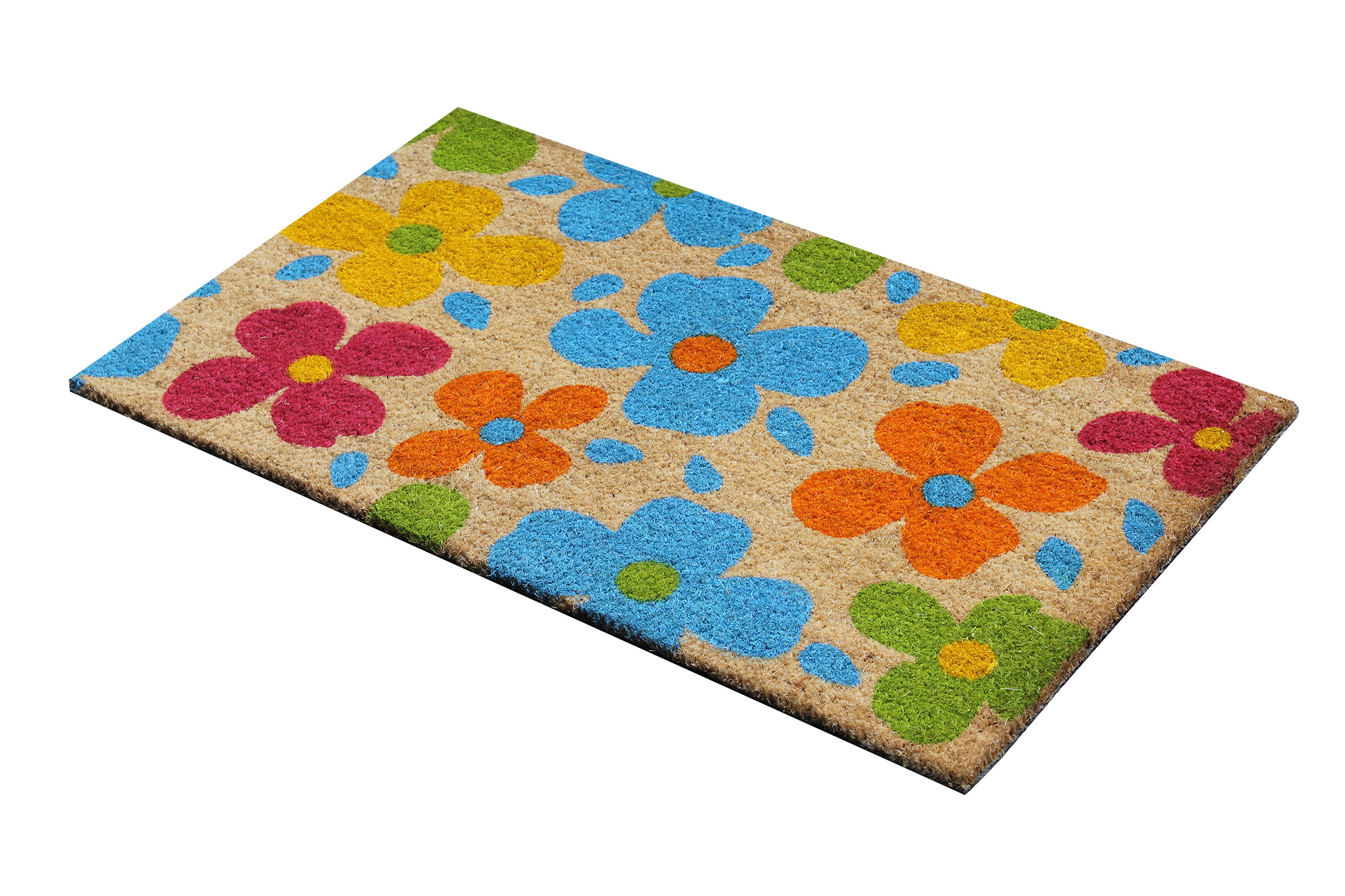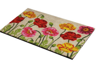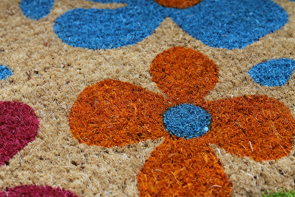 Kokos Happy är en entrématta i 100% kokos för inom- & utomhusbruk (Under tak) i ett färgrikt blomstermönster. Kokosborsten fångar upp grus och smuts och vinylbaksida skyddar golvet från väta samt ger stabilitet mot underlaget.