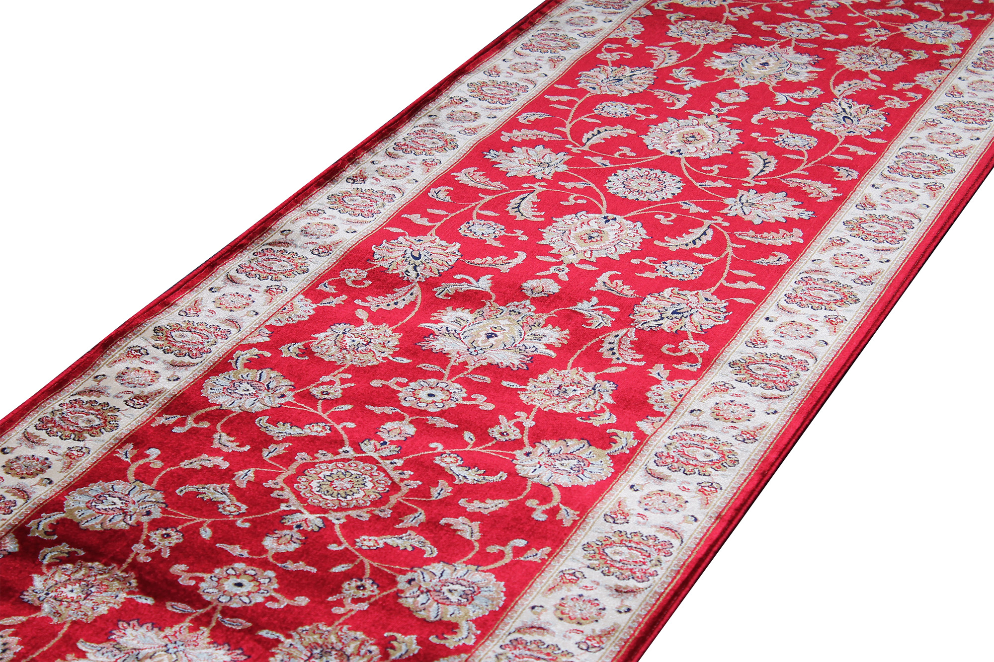 Kamira Silk Röd är en maskinvävd konstsilke gångmatta med otroligt fin lyster, skuren lugg i 100% PES. Trots att mattan är ganska tunn gör den vävda baksidan att den ändå ligger väldigt plant och fint. Mattans blommiga mönster och vackra färgkombinationer har inspiration från Orienten. Finns även i flera olika avpassade storlekar.