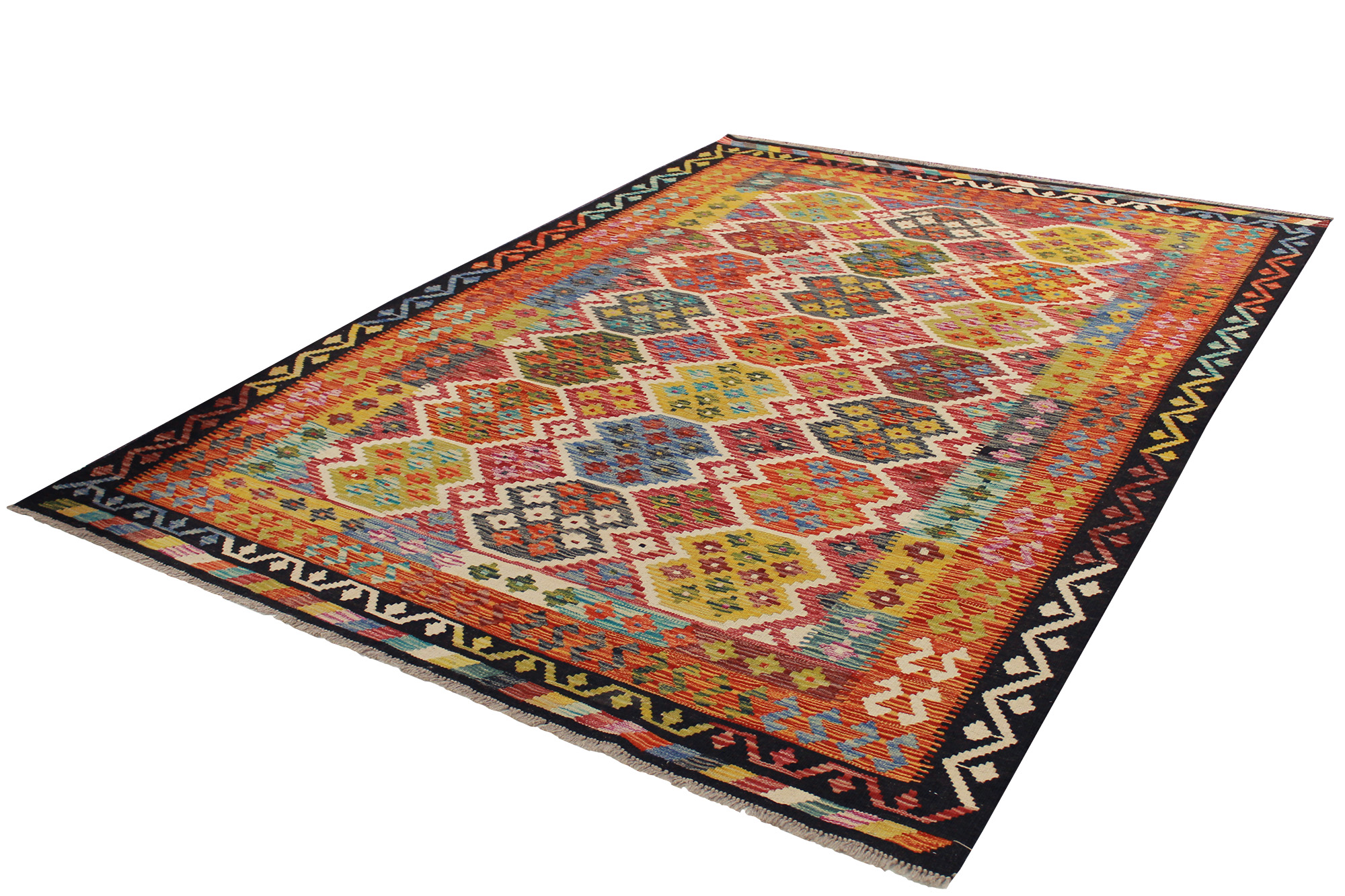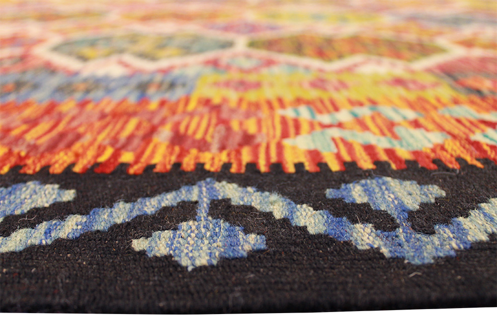 Afghan Kelim Multi 173×249 cm är en modern handvävd kelimmatta, från Afghanistan i 100% ull med ullvarp & ullfrans. Dess vackra varma färger & mönster gör att den passar utmärkt till både moderna & klassiska inredningsstilar. Ullfibern speciella egenskaper gör att den stöter ifrån sig smuts, vilket gör mattan betydligt lättare att dammsuga och hålla ren.