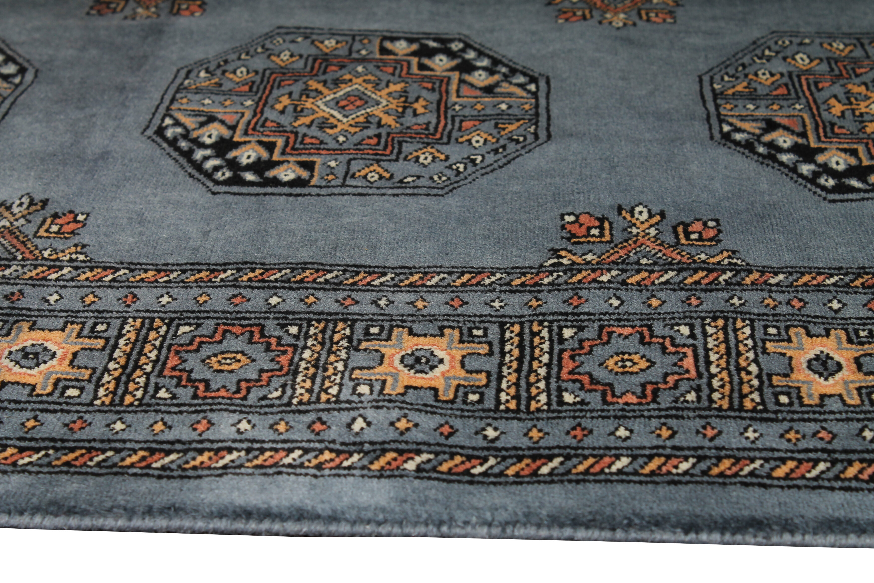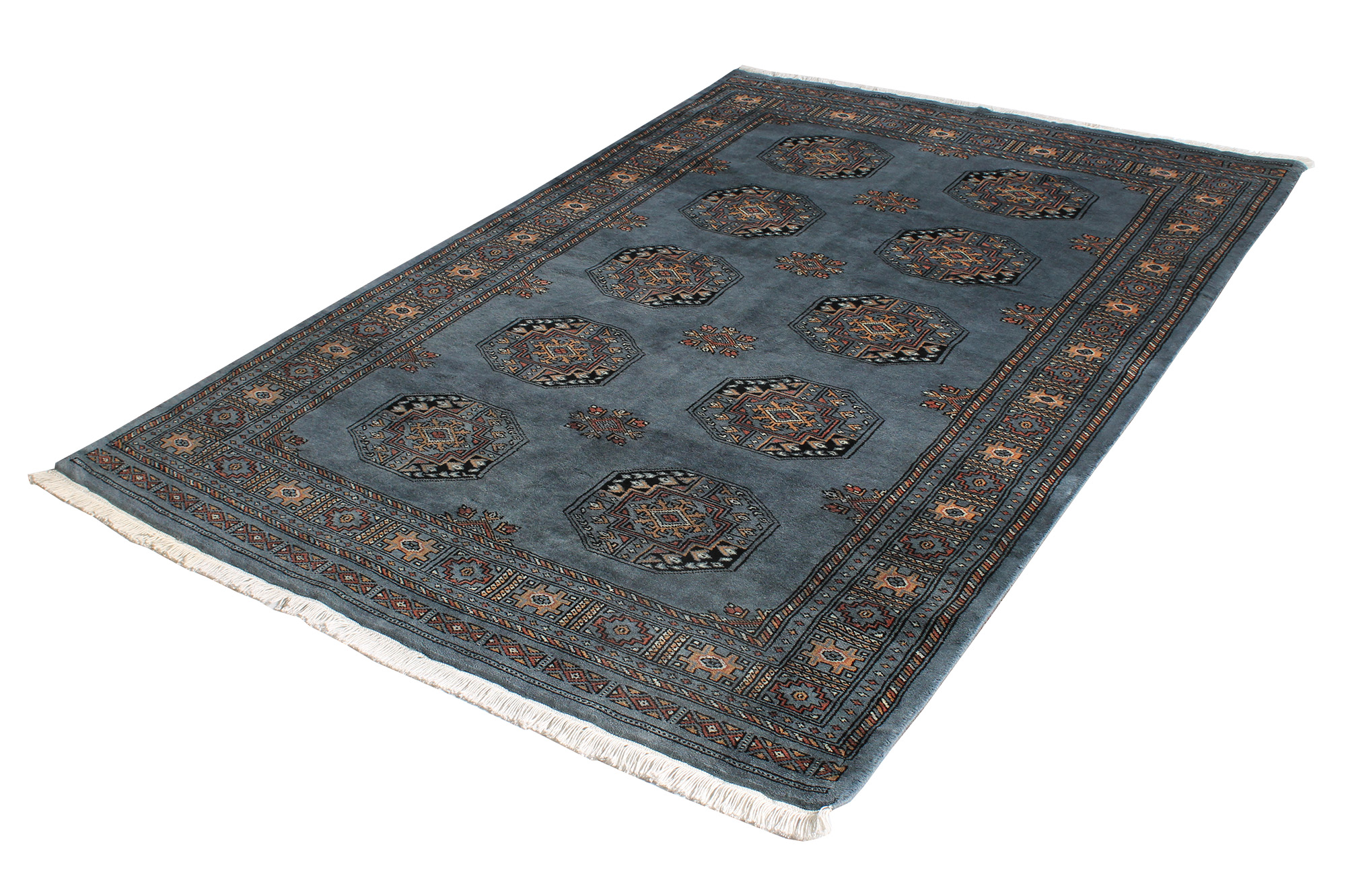 Pakistan Afghan Grå/Blå 138×206 cm är en klassisk handknuten matta i 100% ull från Pakistan med afghanmönster. Bomullsvarp med fransar och otroligt fin lyster. Ullfibern speciella egenskaper gör att den stöter ifrån sig smuts, vilket gör mattan betydligt lättare att dammsuga och hålla ren.