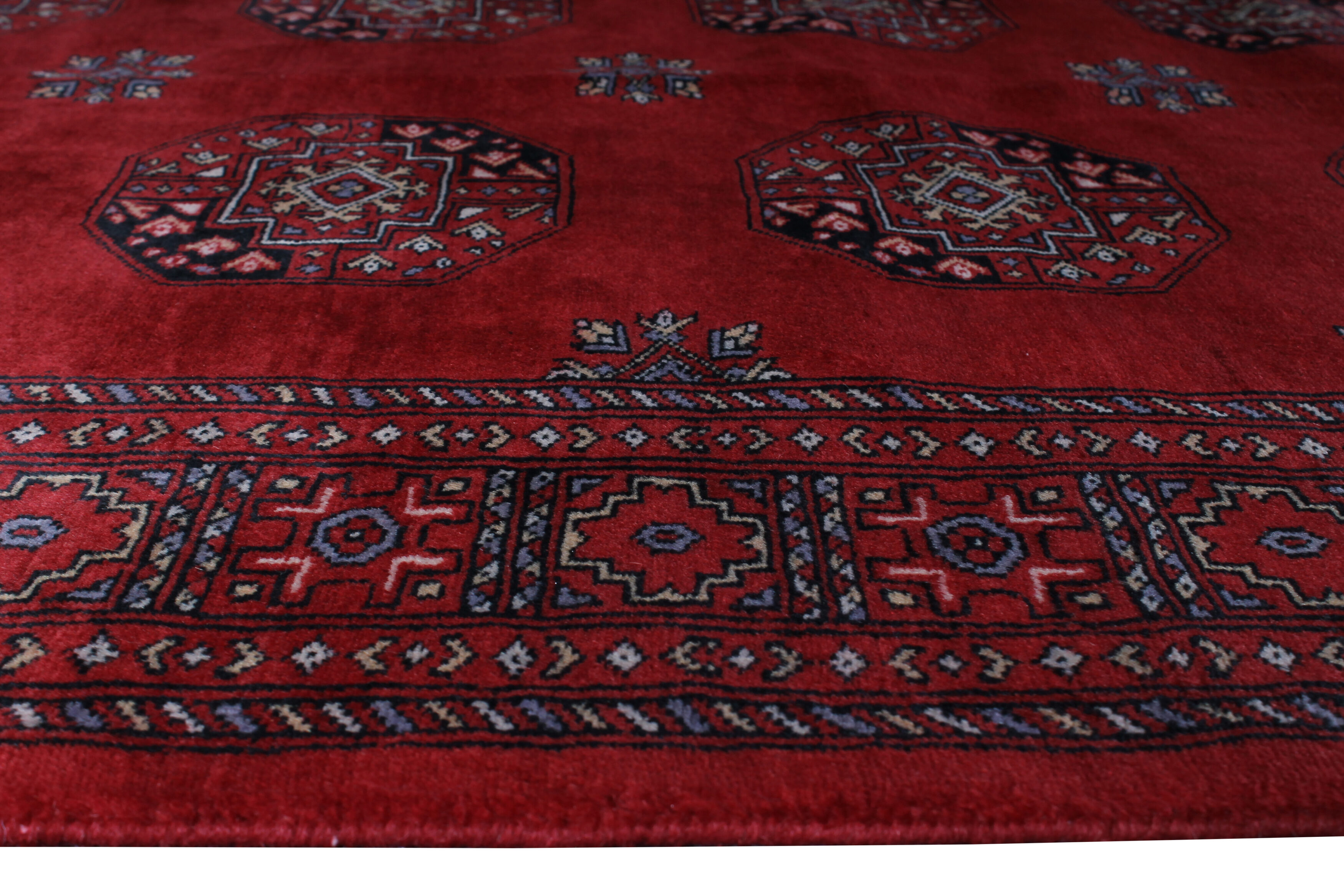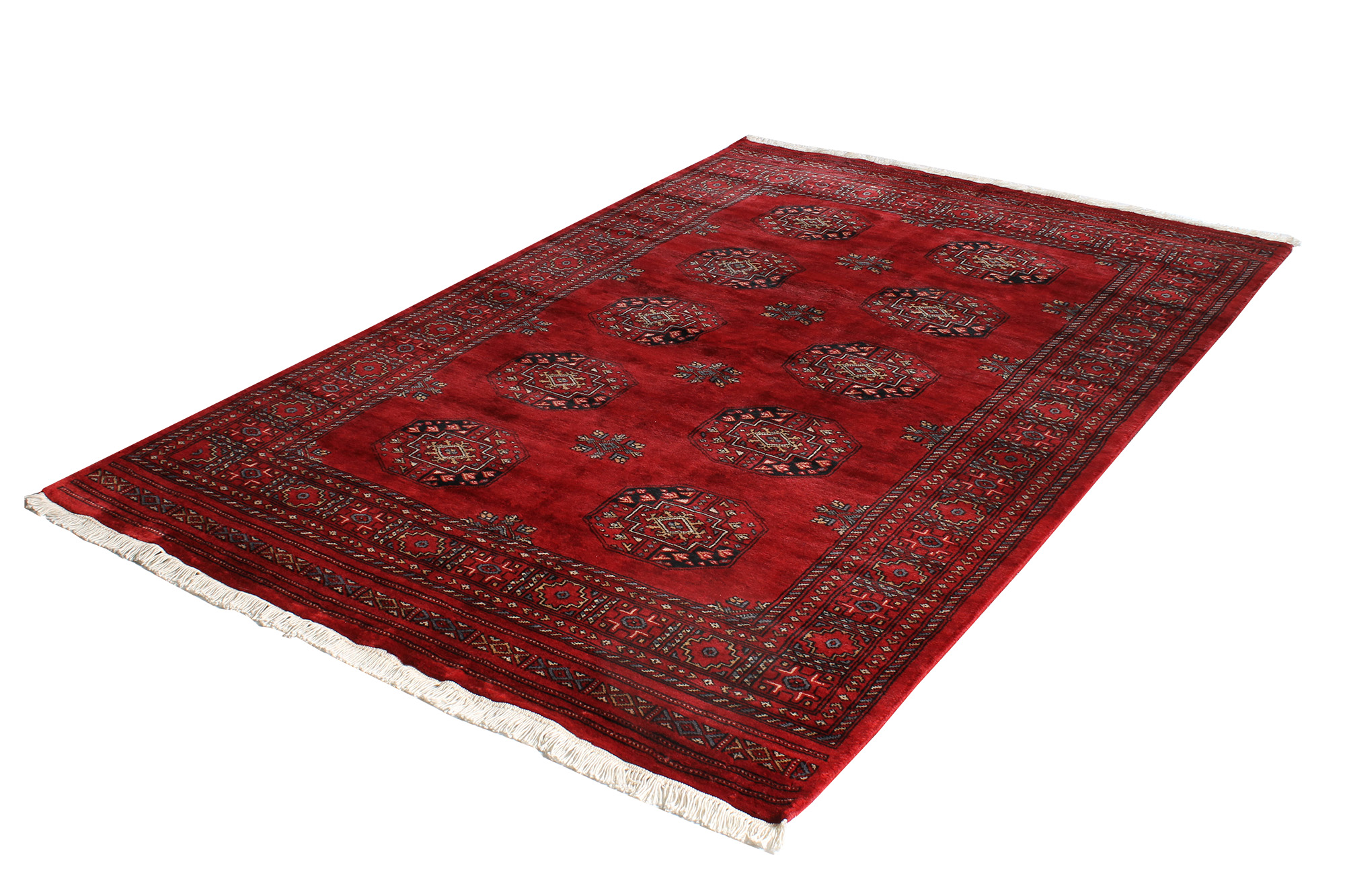 Pakistan Afghan Röd 141×210 cm är en klassisk handknuten matta i 100% ull från Pakistan med afghanmönster. Bomullsvarp med fransar och otroligt fin lyster. Ullfibern speciella egenskaper gör att den stöter ifrån sig smuts, vilket gör mattan betydligt lättare att dammsuga och hålla ren.