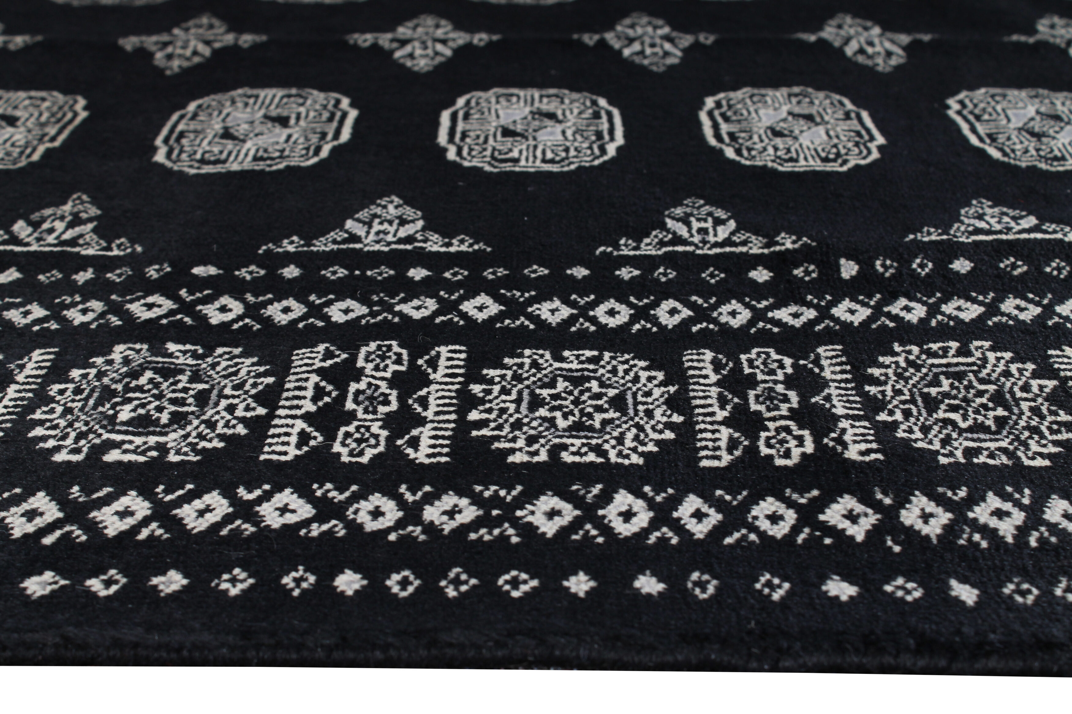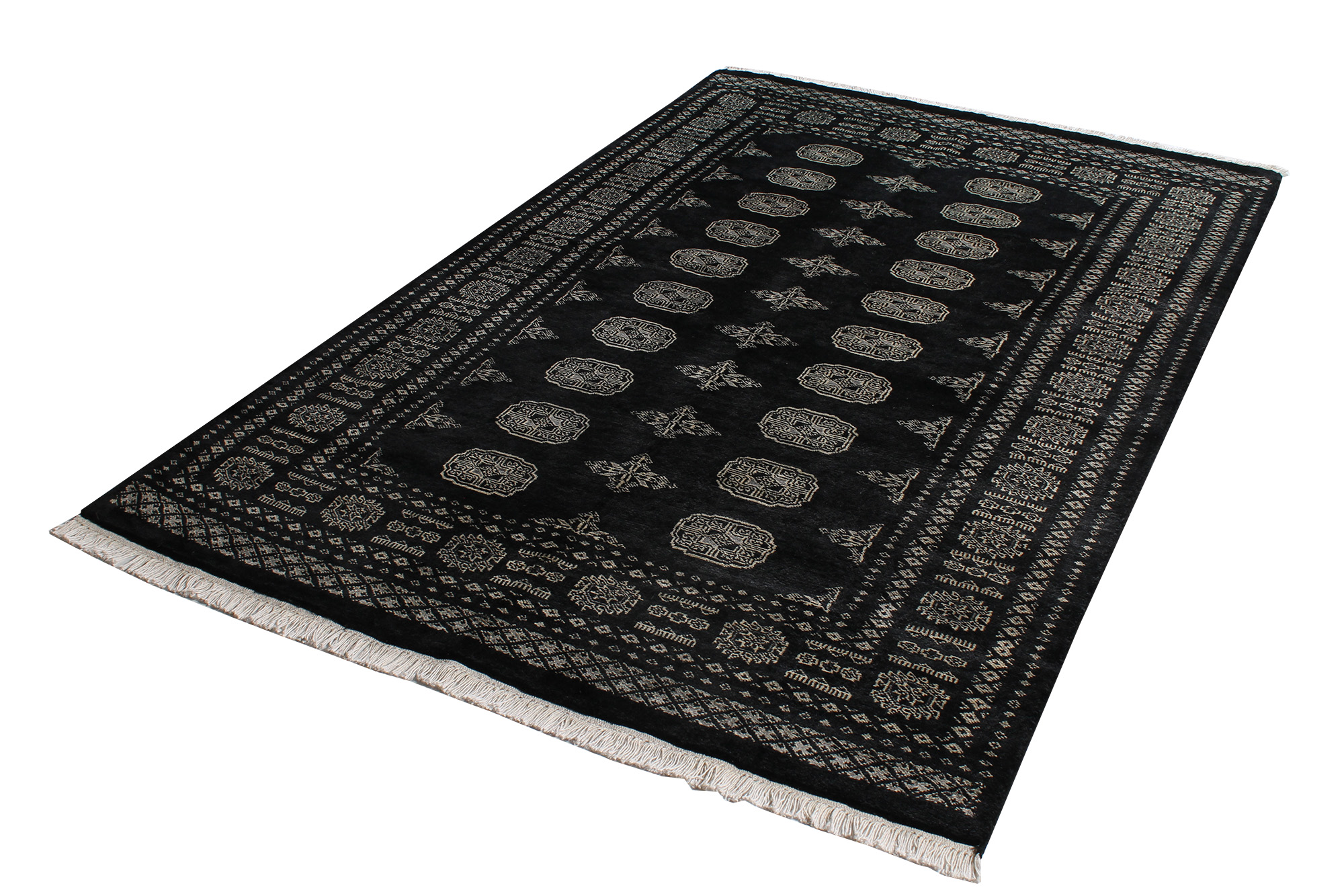 Pakistan Bochara Svart 136×206 cm är en klassisk handknuten matta i 100% ull från Pakistan med bocharamönster. Bomullsvarp med fransar och otroligt fin lyster. Ullfibern speciella egenskaper gör att den stöter ifrån sig smuts, vilket gör mattan betydligt lättare att dammsuga och hålla ren.