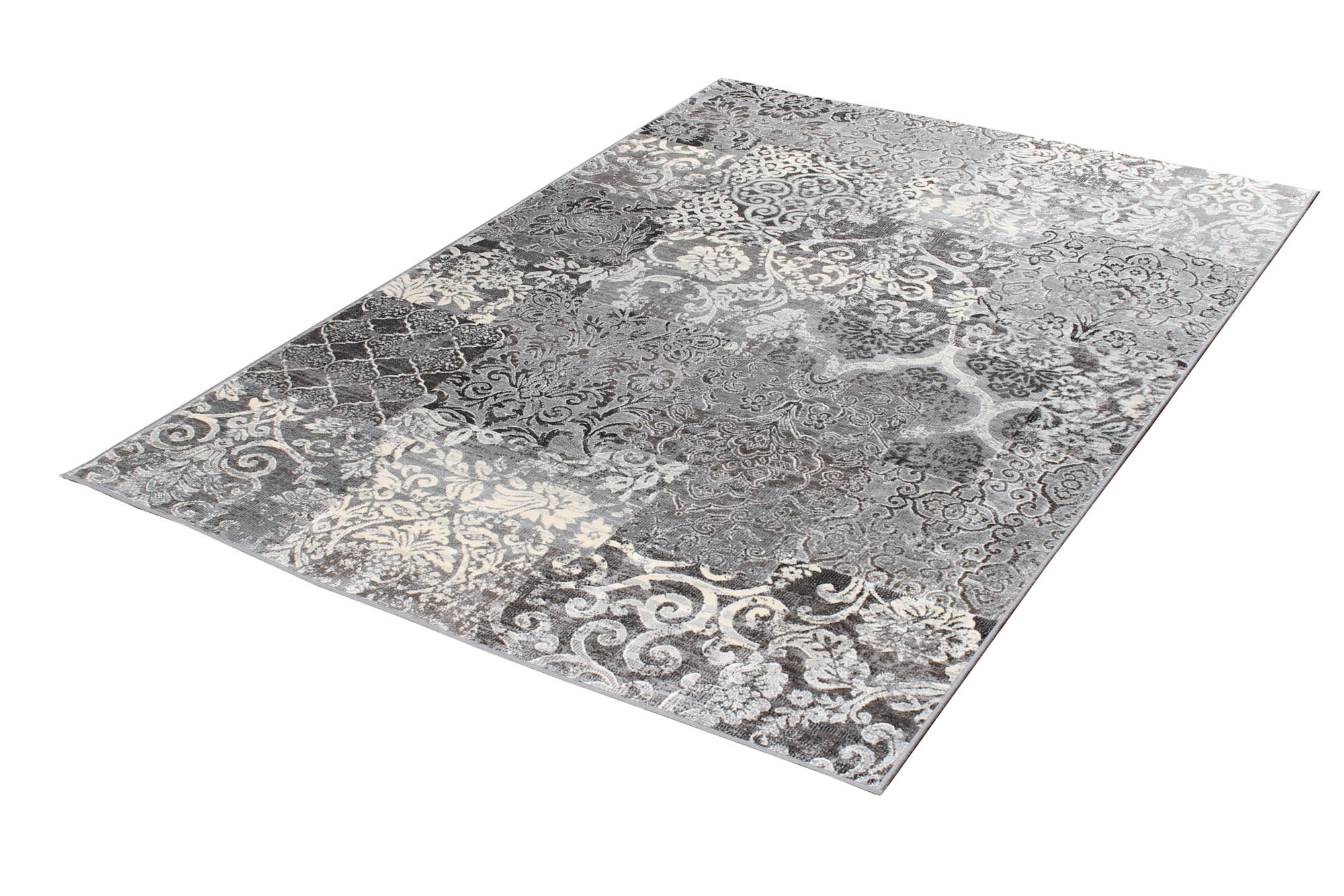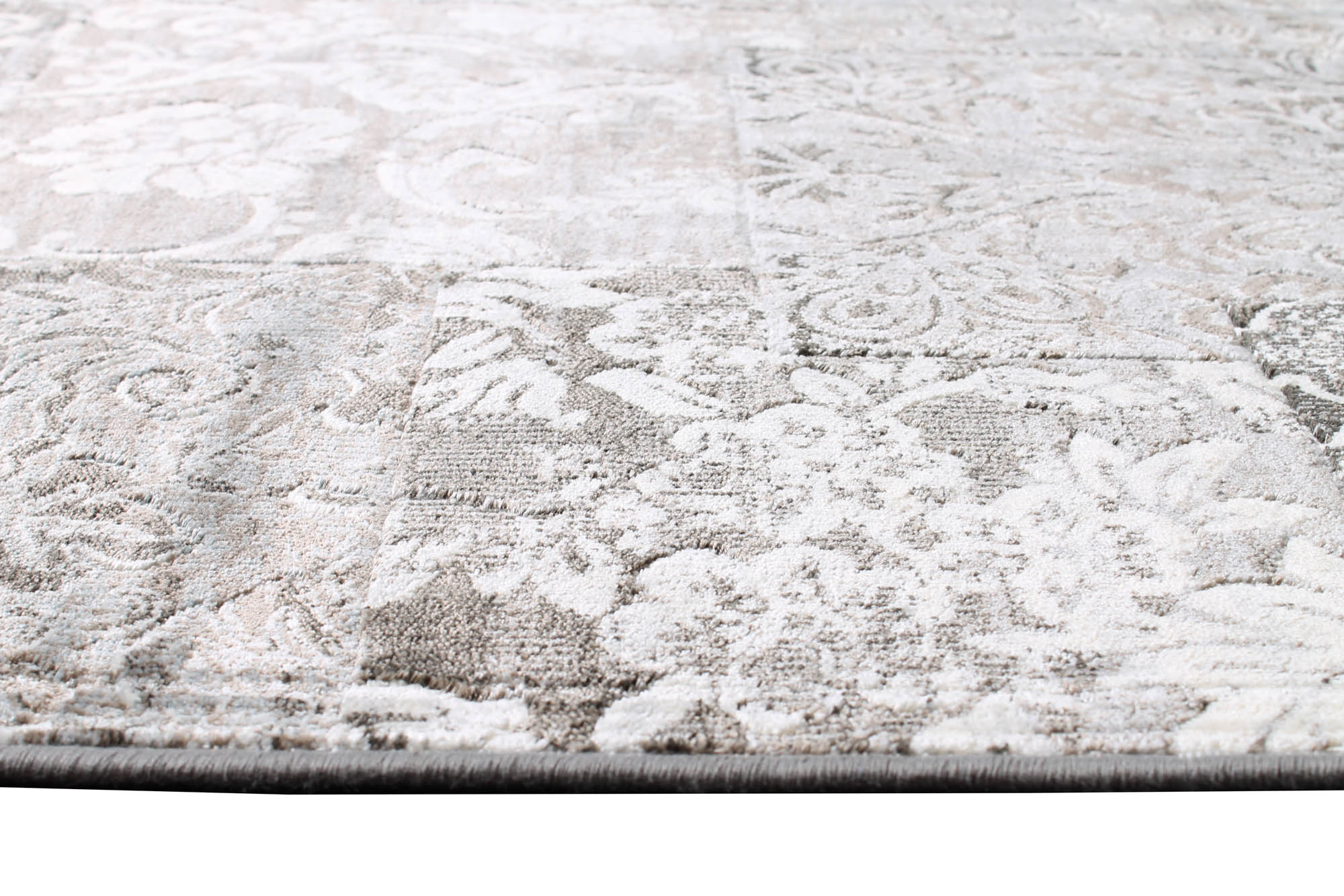 Atalaya Grå är en härligt mjuk maskinvävd konstsilkematta utan frans med otroligt fin lyster, skuren lugg i 100% viskos (vilket är en variant av bomull). Trots att mattan är ganska tunn gör den vävda baksidan att den ändå ligger väldigt plant och fint. Mattans patchworkmönster och vackra färgkombinationer har inspiration från Orienten.